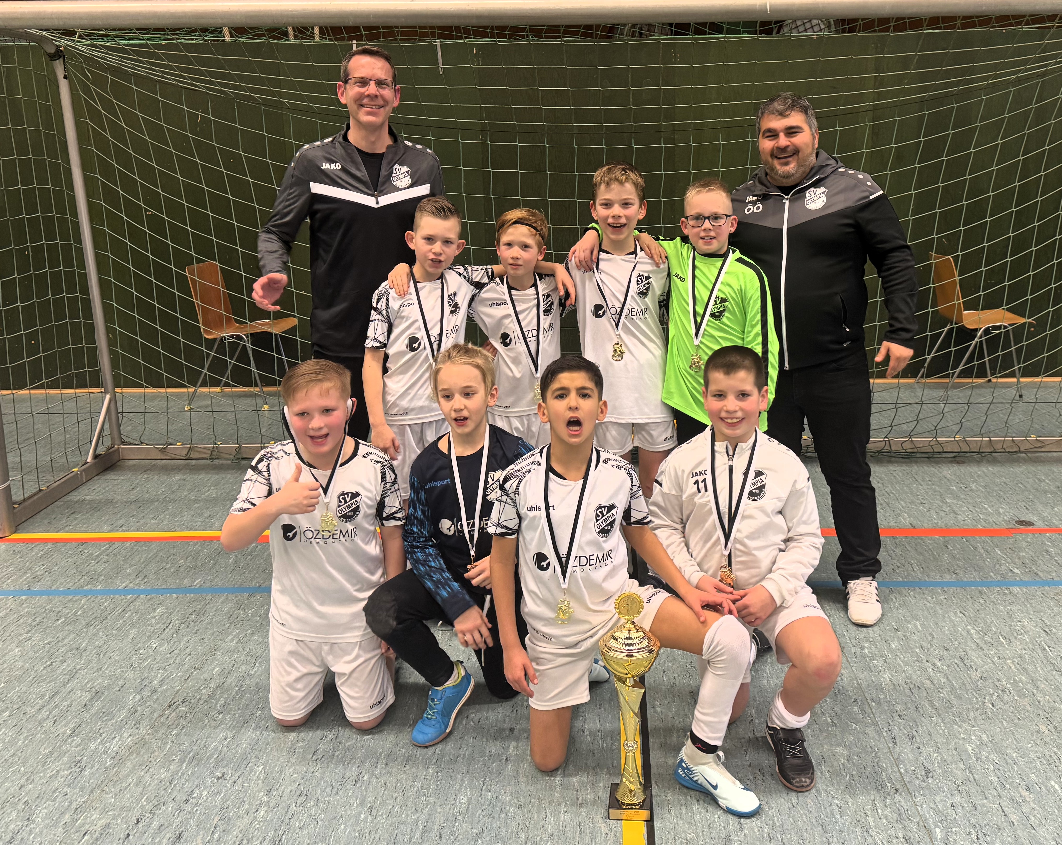 Spannende Spiele, viele Tore und toller Kinderfußball: Die zwei E-Jugendteams der Olympia veranstalteten am Wochenende 8./9.2. gleich drei 2015er-Turniere in Biebesheim.Gespielt wurde in der Rheinhalle, die einmal mehr ihre Eignung auch für größere Turniere unter Beweis stellte und zusammen mit der eigens aufgebauten Bande einen perfekten Rahmen bot.Los ging es am Samstag mit dem hochklassig besetzten "Weissgold's U10 Winter Cup", bei dem überwiegend NLZ- und NLZ-Kooperationsteams antraten und Kinderfußball auf höchstem Niveau zeigten. Dass es unsere E1 als einzige "Dorfmannschaft" nicht leicht haben würde, war wenig überraschend. Gleich das erste Spiel gegen die U10 des Karlsruher SC ging leider deutlich verloren, immerhin gelang unseren Jungs am Ende der schön herausgespielte Ehrentreffer. Im nächsten Spiel gegen Schott Mainz war die Olympia deutlich besser im Spiel, hatte aber mehrfach "Pfostenpech", so dass am Ende ein 1:3 für Schott stand. Gegen Rot-Weiß Frankfurt und die SpVgg Oberrad war unser Team wieder "großzügiger" Gastgeber. Die Jungs steckten aber nicht auf und zeigten gegen die U10 von Darmstadt 98 ihr stärkstes Spiel: Nach erneutem 0:1 glich unser Team aus und schrammte mit doppeltem Innenpfosten sogar hauchzart an der zwischenzeitlichen Führung vorbei. Wenn es auch hier am Ende 1:3 stand - unsere Jungs verabschiedeten sich erhobenen Hauptes aus dem Turnier und konnten zurecht stolz auf sich sein. Turniersieger wurde die U10 des 1. FC Kaiserslautern, die sich im Finale verdient gegen den KSC durchsetzte.